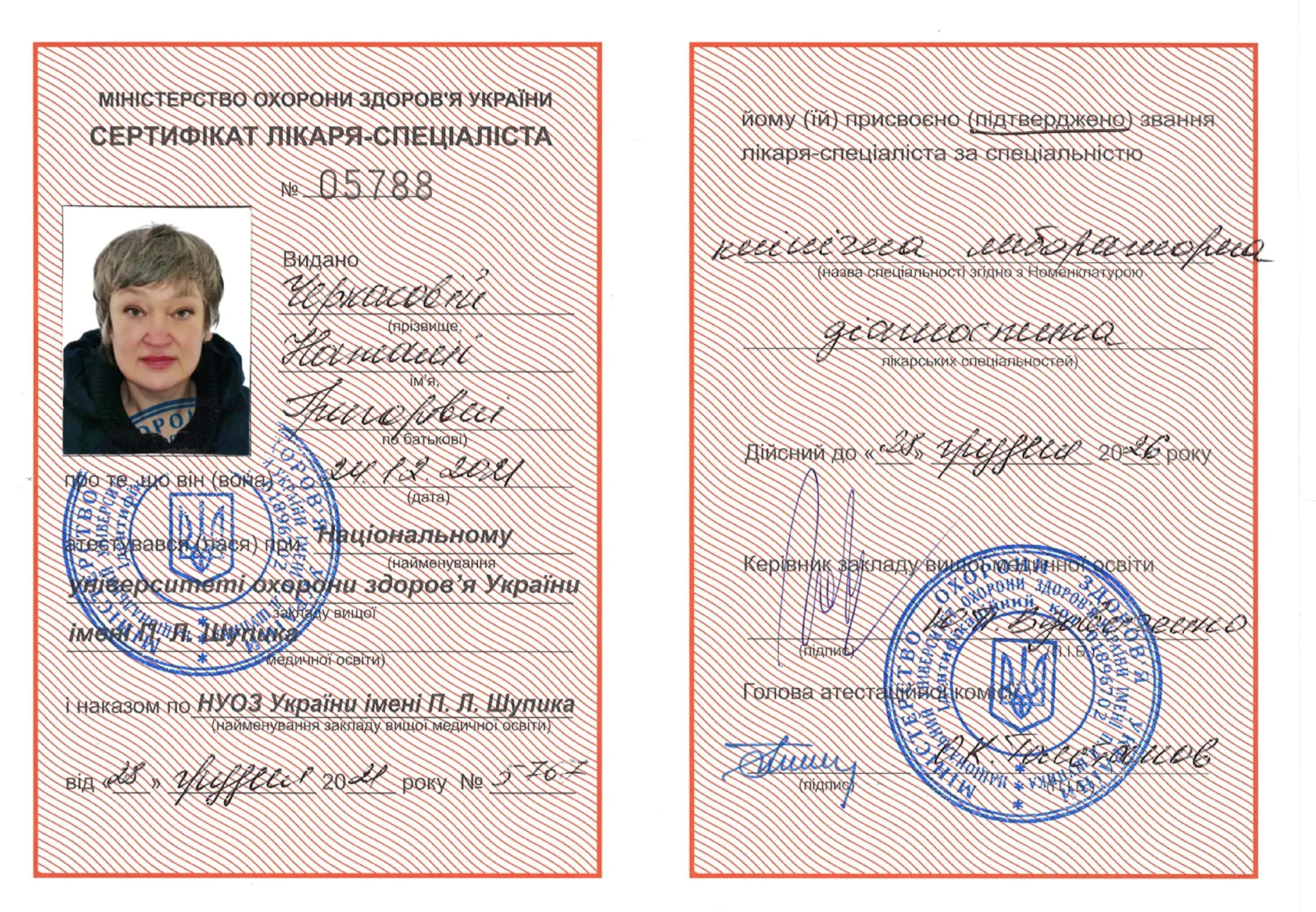 - Интернатура по клинической лабораторной диагностике НУОЗУ им. П.Л. Шупика (1996 г.)