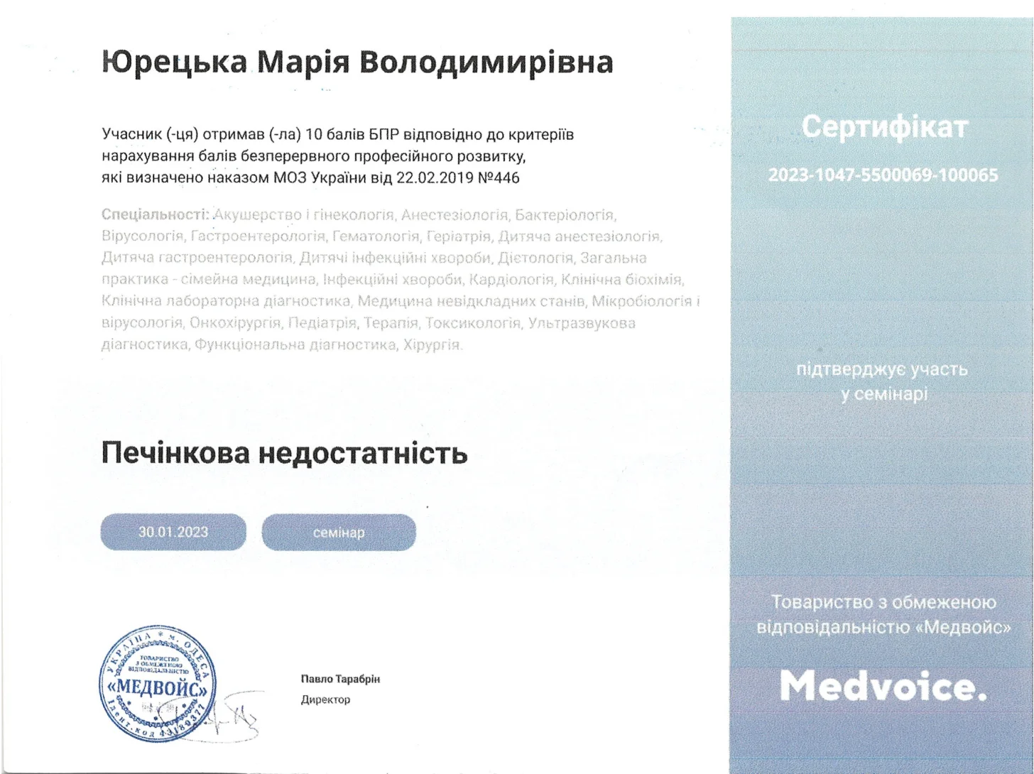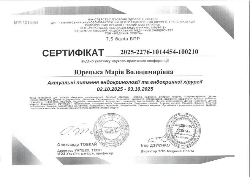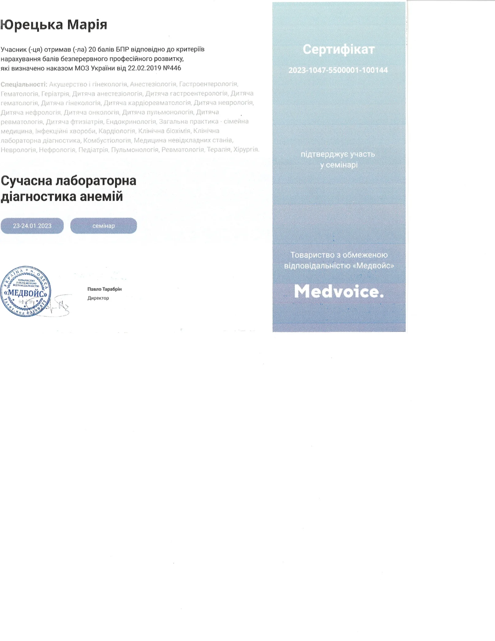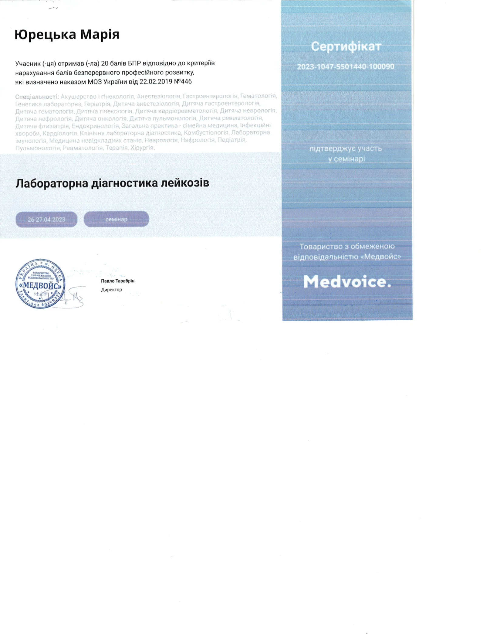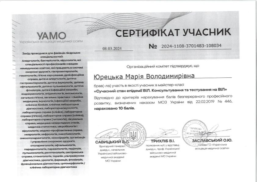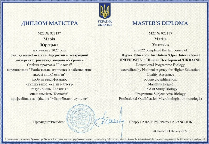 - 2022 г. — Заведение высшего образования «Открытый международный университет развития человека “Украина”» «Лабораторная диагностика. Наименование агентством по обеспечению качества образования». Степень магистра, специальность «Биология». Квалификация: микробиолог-иммунолог.