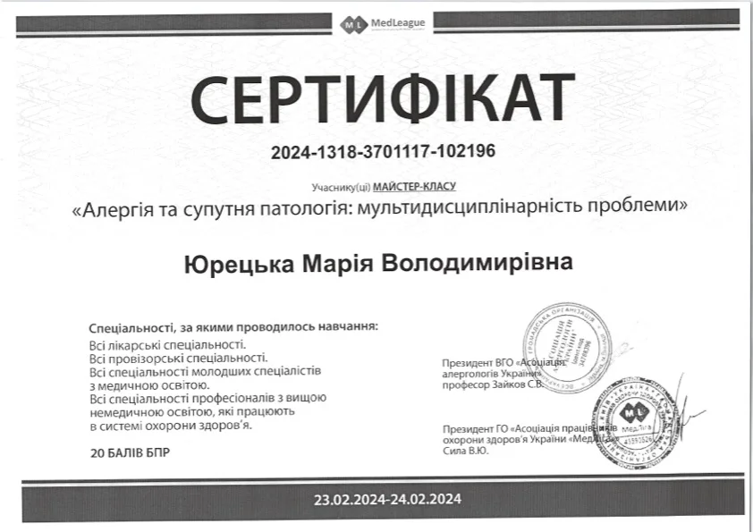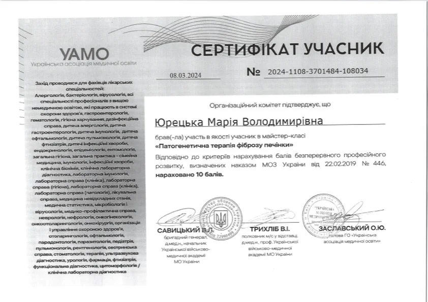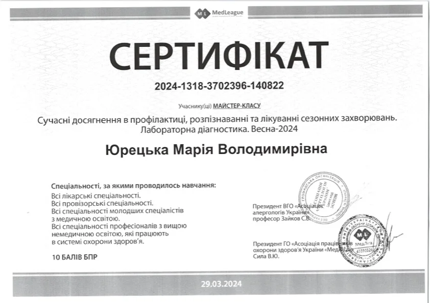 - 2022 г. — Национальный медицинский университет имени А.А. Богомольца Специализация «Клиническая лабораторная диагностика».